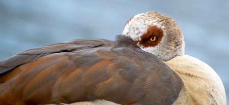 Short portrait of the Nile or Egyptian goose showing its brown tones as well as its face with orange eyes and its beak