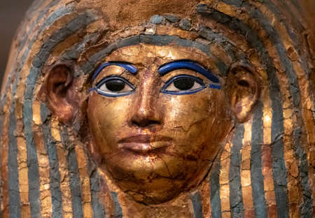 Close up funerary mask of Merit Ptah, an early physician in ancient Egypt (1550 to 1292 BC), made by cloth, linen, plaster, gold leaf, glass, Turin, Italy, Egyptian Museum