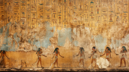 Damaged wall fresco with Ancient Egyptian hieroglyphs, old hieroglyphic writing texture background. Theme of inscription, Egypt, tomb, art, painting, history. Generative AI