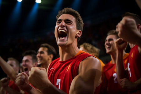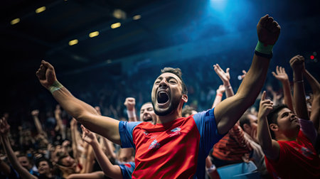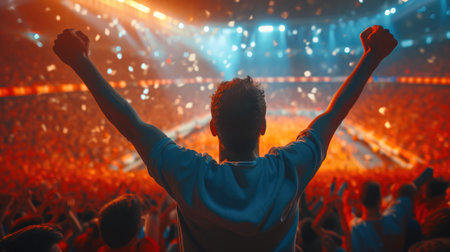 A joyful fan at a soccer event, happily shouting and gesturing with his arms in the air, showcasing his love for the game. AIG41