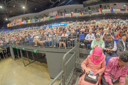 Christchurch, New Zealand - Disember 15th, 2017 : Crowd of people sitting on chairs listening to speaker at graduation ceremony at University of Canterbury