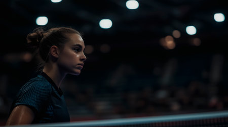 A young woman, intensely focused, stands at a table tennis table, ready for the next point. The background is blurred, highlighting the player's concentration.