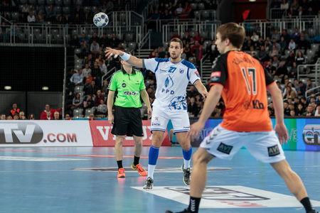 ZAGREB, CROATIA - FEBRUARY 25, 2017: EHF Champions League PPD Zagreb VS IFK Kristianstad. Stipe MANDALINIC (27) passing the ball