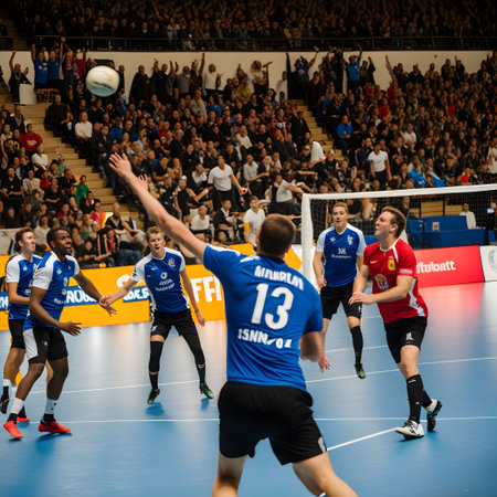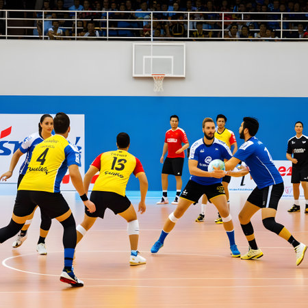 A dynamic moment occurs as a goalkeeper focuses on preventing a goal in an exciting indoor handball match, showcasing athleticism and teamwork.