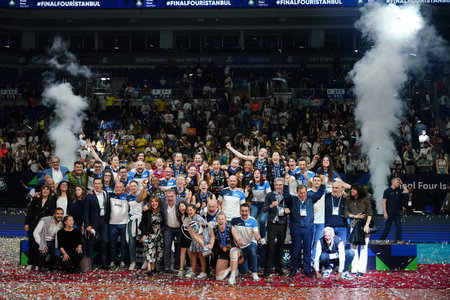 ISTANBUL, TURKIYE - MAY 04, 2025: Imoco Volley Conegliano players celebrating winning of CEV Champions League Volley Final Four in Ulker Sports Arena