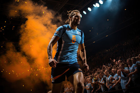 a man team in a sport uniform playing with ball or training in stadium indoor.