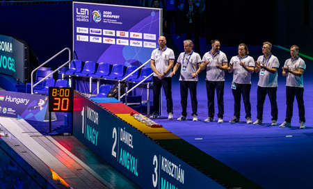 Budapest Hungary Jan 24, 2020: Hungarian Coaches on the 34th Men's European Water Polo Championship. The tournament for national teams. Hungary - Spain for the 1st & the 2th place. Hungary got the GOLD by 14-13.
