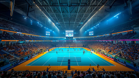 Sold out arena with fans cheering on teams in live tv broadcast for national basketball tournament
