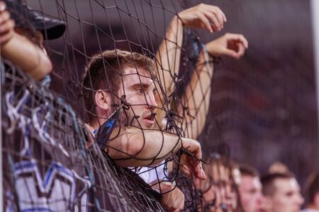 KAMENSKY, Ukraine - February 14, 2020. Sports spectators, fans do not support their team during women's volleyball tournament. Sports fans, ultras on grandstand
