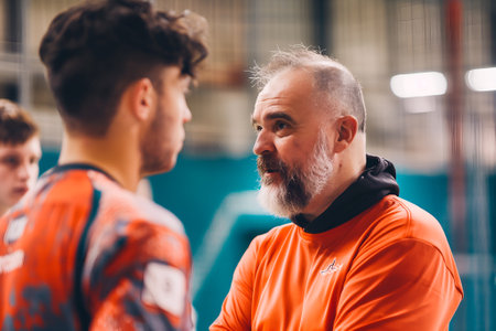 A man wearing a sports jersey and a beard is chatting with a young player in a gym. They seem to be discussing a competition event or leisure event, having fun in the process