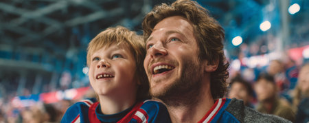 Father son hockey crowd stadium cheering smiling joyful family game night thrill as father son hockey crowd stadium cheer together, smiling with