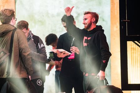 MOSCOW, RUSSIA - OCTOBER 27 2018: EPICENTER Counter Strike: Global Offensive esports event. Olof olofmeister Kajbjer from winners team FAZE clan on a stage thanks the fans for support showing thumb up