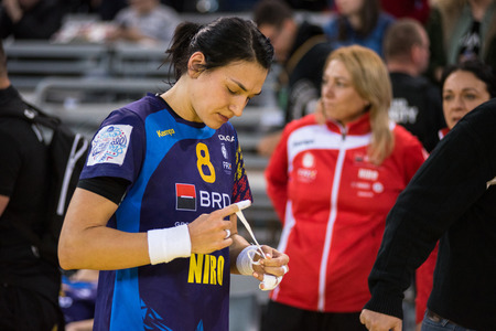 CLUJ NAPOCA, ROMANIA - MARCH 25, 2018: Cristina Neagu handball player celebrating a victory against Russia. She is the only player in history to win three IHF World Player of the Year awards