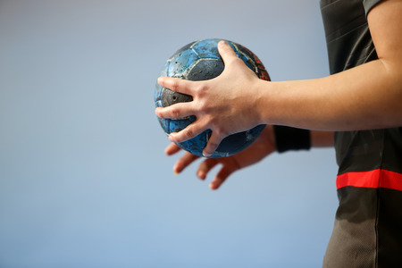 Thessaloniki, Greece - February 13, 2016: Undefined hands holding a ball prior to the Greek Women Cup Final handball game Arta vs Nea Ionia