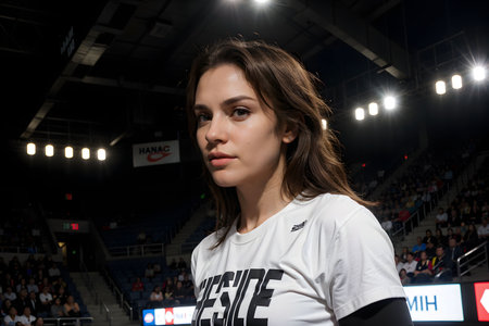 An AI generated illustration of A female tennis fan wearing black gloves stands on a court observing a tennis match intently