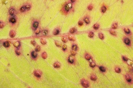 Parasitization of a green leaf by fungi Puccinia commonly called plant rust orange color natural lighting
