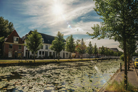 Canal with aquatic plants, streets on the banks and brick houses on a sunny day in Weesp. Quiet and pleasant village full of canals and green near Amsterdam. Northern Netherlands. Retouched photo