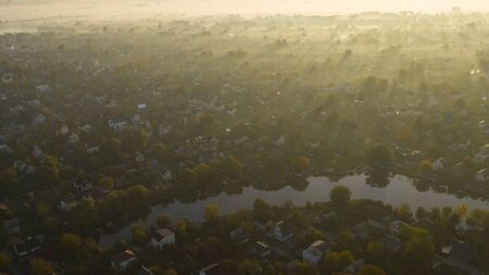 Beautiful misty evening landscape photographed from drone. Magical atmosphere.
