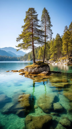 A picturesque view of a tranquil mountain lake surrounded by lush green forests and majestic snow-capped peaks, ideal for nature lovers.