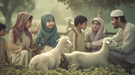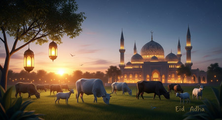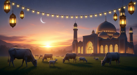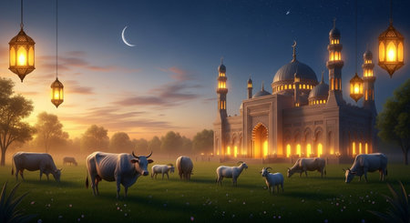 Eid al -adha background with sheep's and silhouette mosque.Generator AI.