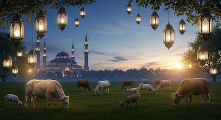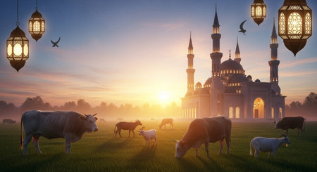 Ramadan Kareem greeting card. Cows graze on green meadow with mosque and lanterns.