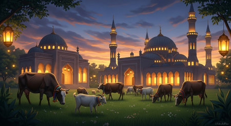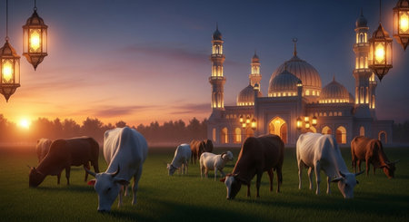 Cows grazing in front of the mosque at sunset. Ramadan Kareem background