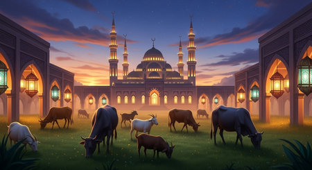 A sheep peacefully grazing before a mosque as the sun sets, creating a serene atmosphere for Eid al-Adha