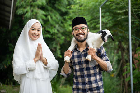 happy muslim couple buy a goat for eid adha sacrifice or qurban celebration