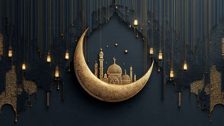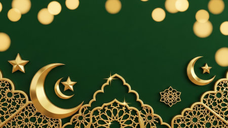 A richly decorated image featuring intricate golden Islamic patterns against a dark green backdrop. The design includes crescent moons, stars, and traditional geometric motifs, creating a sense of elegance and spirituality.