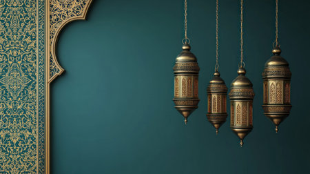 A radiant blue background illuminating, surrounded by simple Islamic patterns in gold and dark green colors with lanterns hanging from the top right corner. --chaos 30 --ar 16:9 --v 6.1 Job ID: 8a81c7a1-2f39-494d-9948-a5380f8cc845