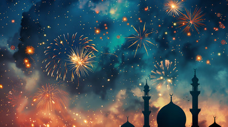 A festive background with vibrant fireworks lighting up the night sky above mosque silhouettes, celebrating the Islamic New Year with a display of colorful sparks and stars