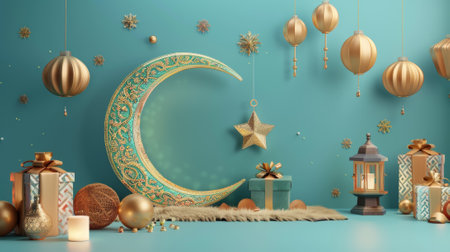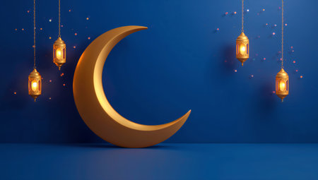 A gold crescent moon is displayed against a blue background. Hanging lanterns with light add warmth to the scene. Small decorations create a festive look at night.