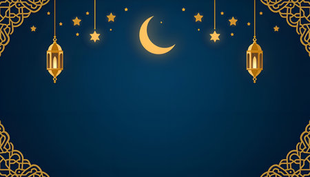 Ramadan Kareem background with golden lanterns and crescent moon