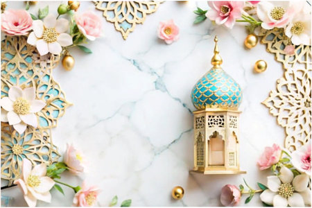 Decorative Islamic lanterns, floral embellishments, marble background, celebration