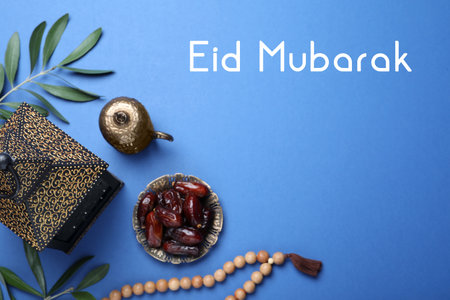 Eid Mubarak greeting card. Flat lay composition with Arabic lantern and misbaha on blue background