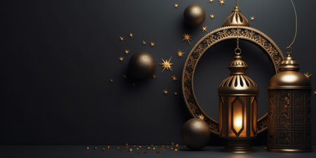 Ramadan background with lanterns, palm leaf and crescent moon on black background. Space for text. Banner.