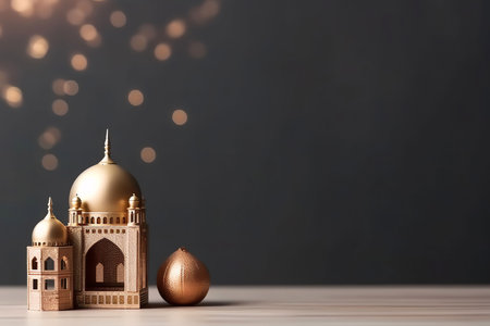A golden mosque model on a white table, representing Islamic faith and culture.