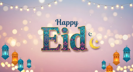 A heartfelt 'Happy Eid Mubarak' message written in elegant script, set against a backdrop of soft, out-of-focus lights, creating a festive and celebratory atmosphere.