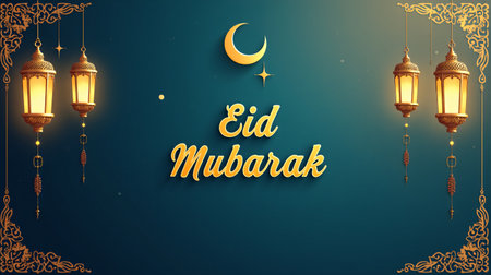 An image showcasing a festive Eid Mubarak celebration with intricate lanterns and crescent moon decorations against a blue background.