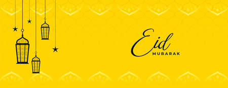eid mubarak yellow banner with lanterns and stars