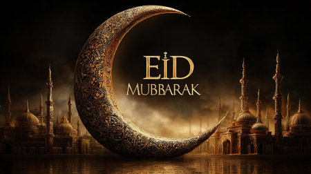 This image showcases a golden Eid Mubaarak greeting, complemented by detailed mosque silhouettes and an intricately patterned crescent moon against a dark background, radiating a celebratory ambiance.