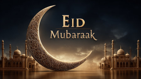 Elegant Eid Mubarak artwork featuring a detailed crescent moon and mosque. The scene is bathed in golden light with a dark backdrop, perfect for festive greetings and spiritual reflection.