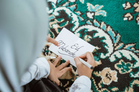 child making a happy eid mubarak greeting card
