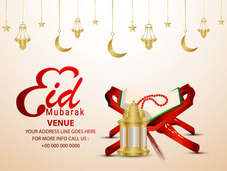 Eid mubarak greeting card with dates, lantern and holy quran