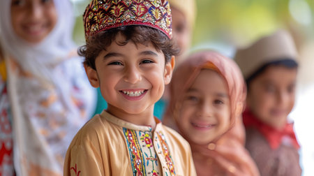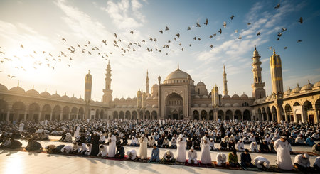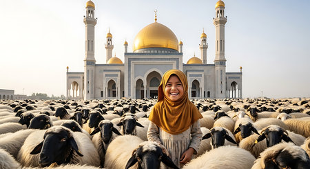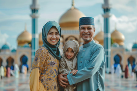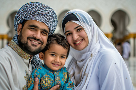 Muslim family celebrating Eid al-Adha Mubarak in the mosque.