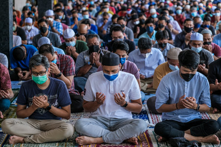 KUALA LUMPUR, MALAYSIA - APRIL 01, 2022: Muslim dua during Friday or Jumaat mass prayers at National Mosque.