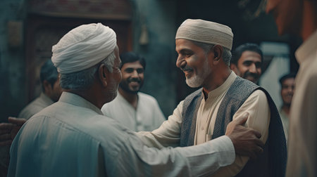 In a village in India, a group of elderly Muslim men engage in animated conversations, exchanging stories and wisdom amidst a colorful ambiance that defines their rustic community.