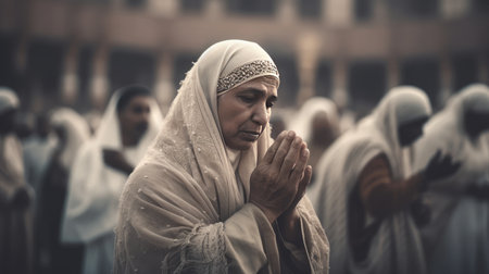 Religious Muslim people praying in the mosque. Ramadan celebration