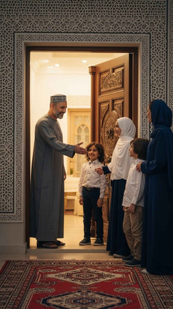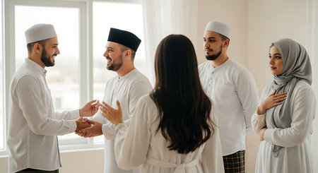 Muslim family greeting each other during Eid al-Fitr celebration at home