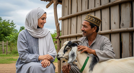 Muslim man and woman sitting with goat in the farm. Concept of Muslim family.